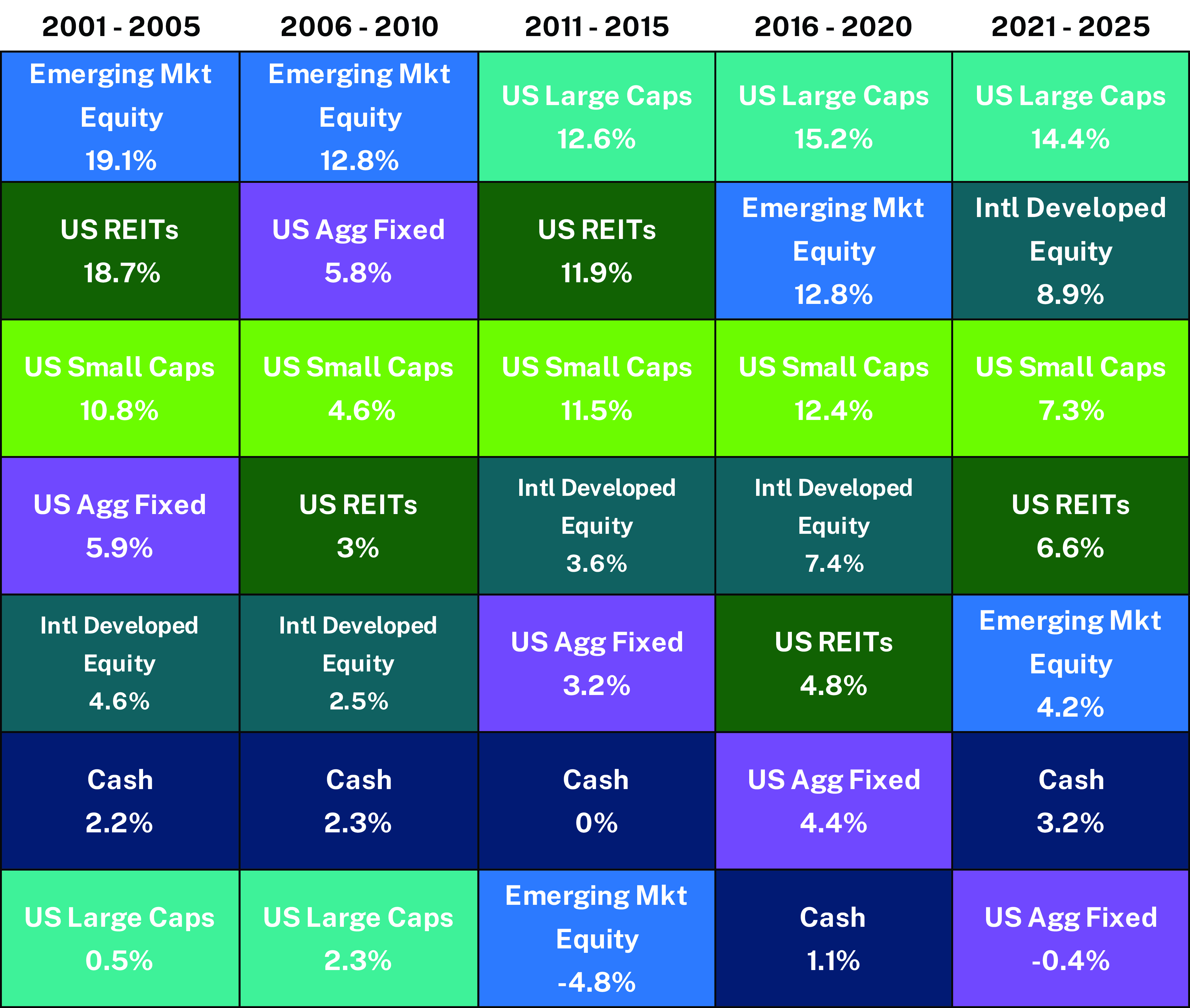 History reminds us that no asset class wins every month, quarter, year – or every 5 years.