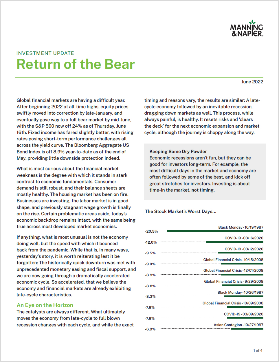 Download our Investment Update for Financial Professionals, where we walk through our views on the state of the global economy, where we are in the market cycle, how we're managing inflation – and what this may mean for your practice and clients in the uncertain times ahead.
